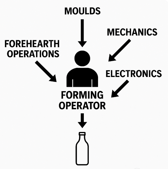 In glass manufacturing, everything from the supporting departments, moulds, mechanics, forehearth operations, machine repair, electronics, comes together and is handed to the forming operator.